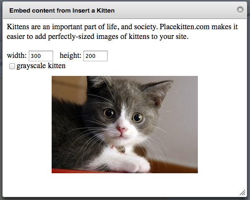 This shows adding an editor button to the rich editor in course/group content. Clicking the new kitten icon will pop up a dialog that uses placekitten.com to generate an image of a kitten set to the user's specified dimensions.